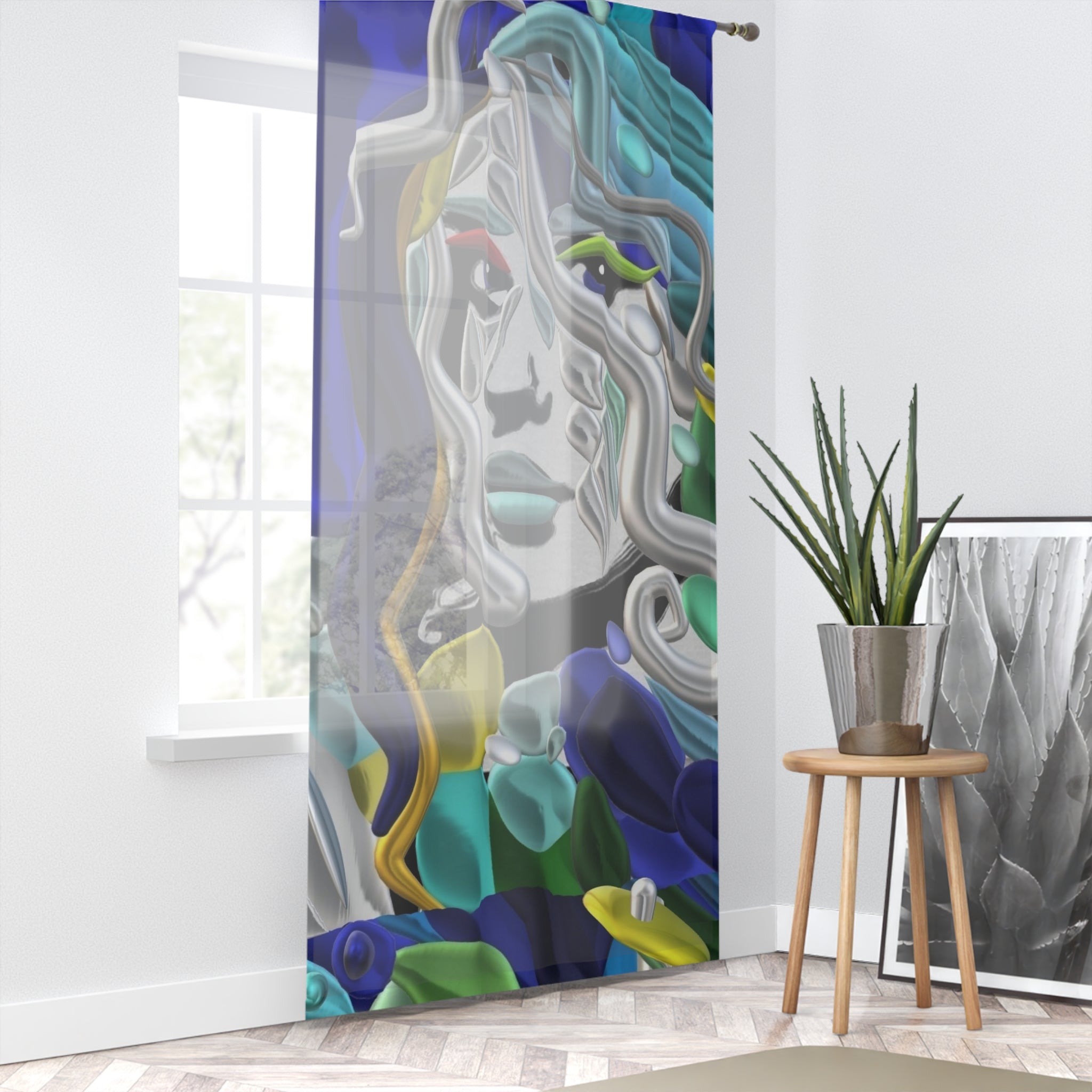Tenda moderna con la stampa esclusiva della collezione -IL FIUME DI GALATEA-di Laila Lago & C. by I.A. Un'opera d'arte per le tue finestre, caratterizzata da colori creativi e originali che donano un tocco artistico e sofisticato ad ogni ambiente.