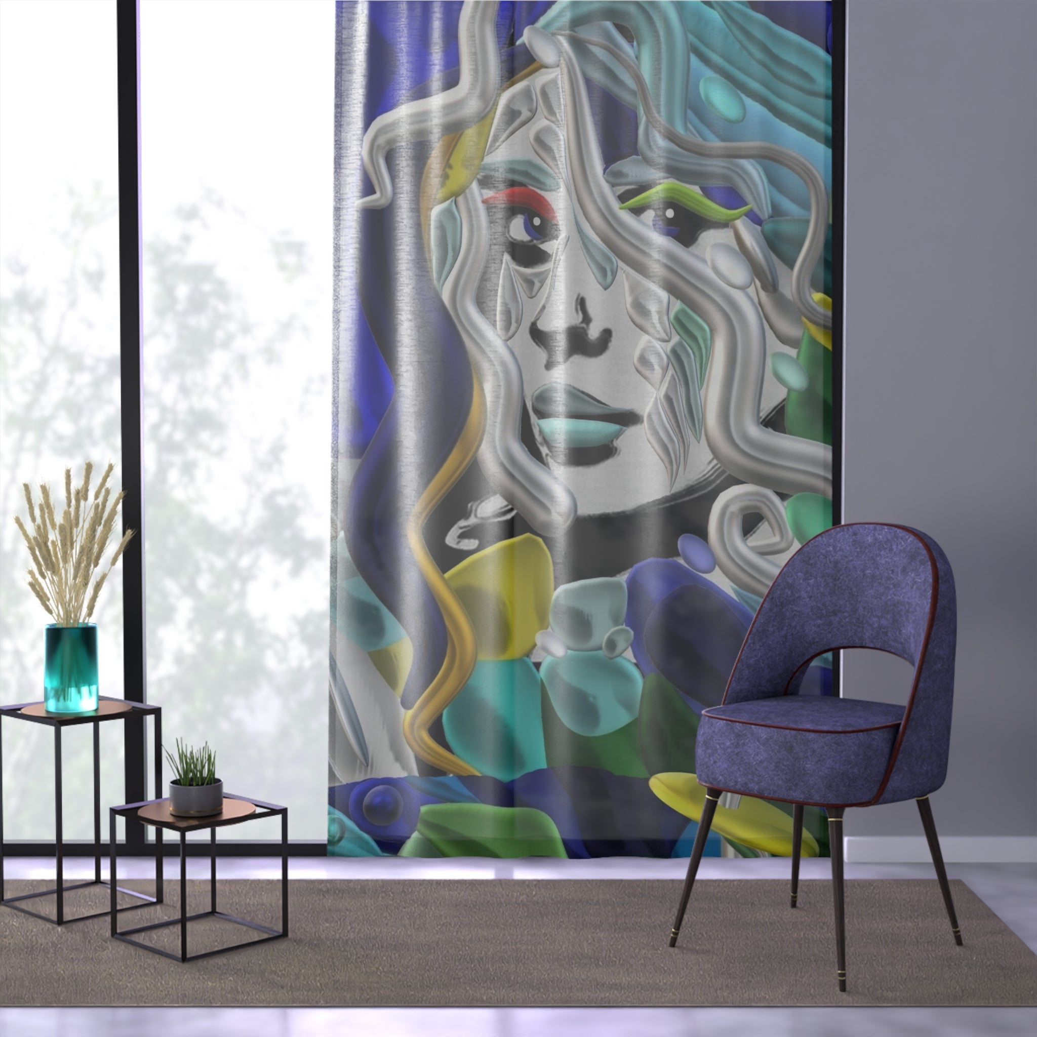 Modern curtain featuring an exclusive print from the -IL FIUME DI GALATEA- collection by Laila Lago & C. by I.A. A true work of art for your windows, distinguished by creative and original colors that bring an artistic and sophisticated touch to any room.