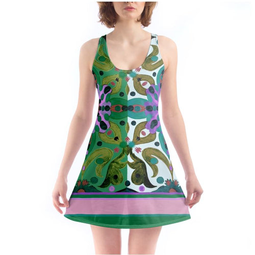 Beachwear line -ACQUARELLI VERDE BLU- a line of dresses, swimsuits, and bikinis matched with sandals, cover-ups, and accessories, scarves, sundresses, tops, printed with the colors of the collection designed by Laila Lago & C. by I.A. The precious bags handcrafted feature the elegant print of the collection. Sunny and creative colors for a magical summer in the name of color.
