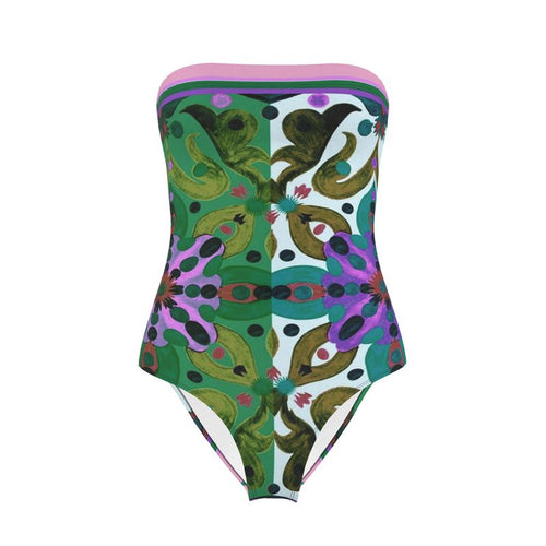 Linea abbigliamento mare -ACQUARELLI VERDE BLU- una linea di abiti costumi bikini abbinati a sandali, copri costumi e accessori, foulard, prendisole, top, stampati con i colori della collezione disegnati da Laila Lago & C. by I.A. Le borse preziose realizzate artigianalmente riportano l'elegante stampa della raccolta. Colori solari e creativi per un estate magica all'insegna del colore