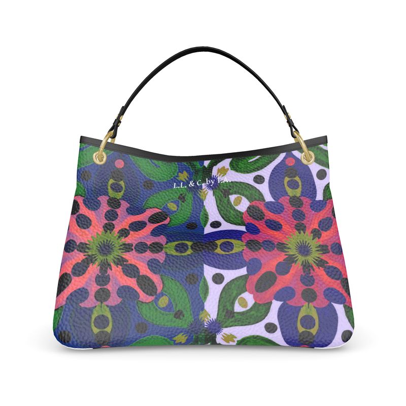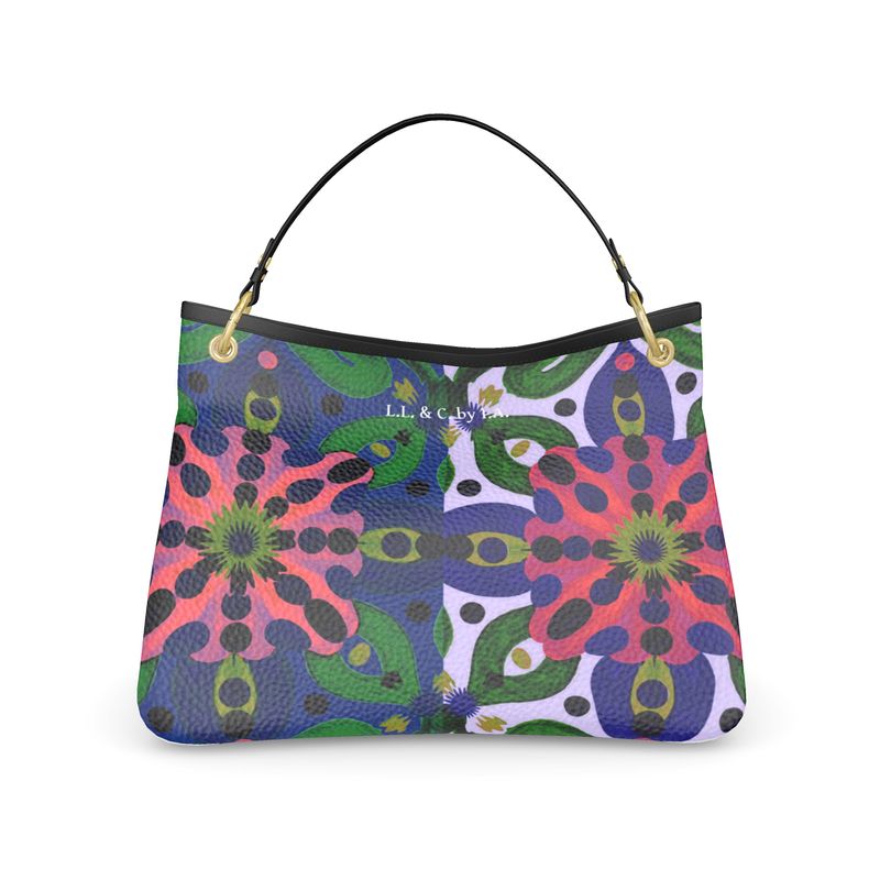 Elegante borsa capiente in pelle testurizzata, realizzata artigianalmente con logo stampato della casa, all' esterno e all' interno, stampa artistica floreale con splendidi colori che rendono questa borsa un accessorio prezioso dettagli dorati