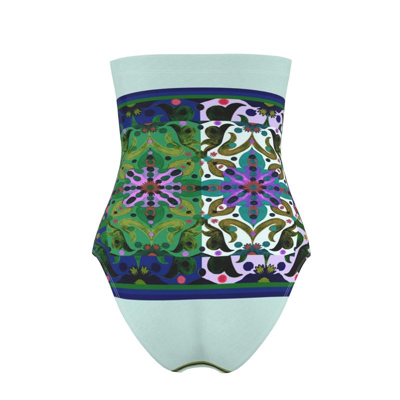 Un meraviglioso costume da usare anche come body sotto un pareo estivo, molto elegante, caratterizzato da colori raffinati, disegnati dall' artista per questa splendida raccolta.