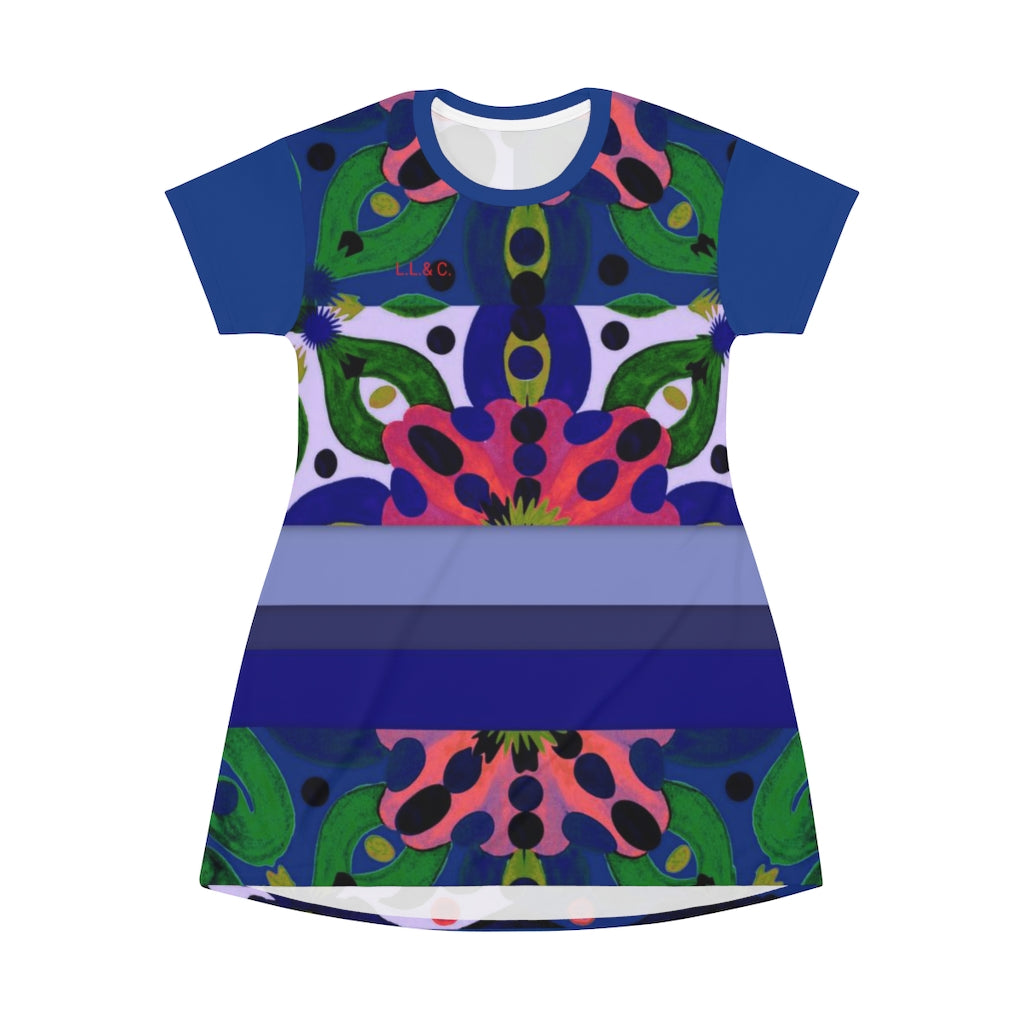 This All-Over-Print T-Shirt dress, cut to size and sewn to fit every style. A wonderful print makes this dress unique from the ACQUARELLI VERDE BLU Laila Lago & C. collection by I.A. a dress that has style and gives art to your clothing