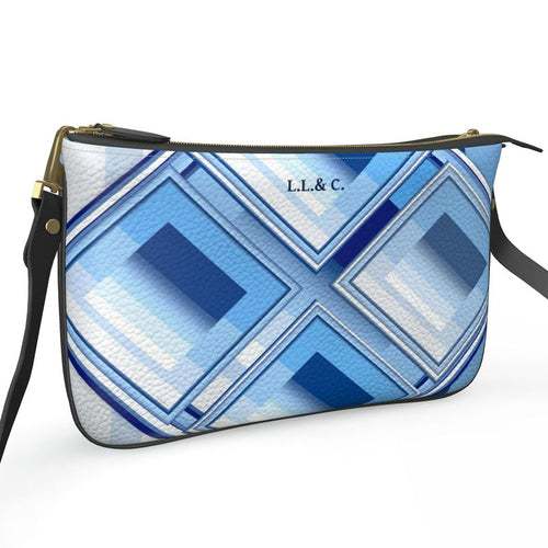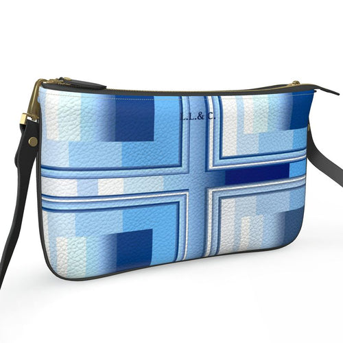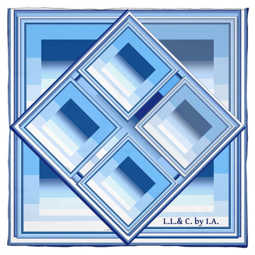 Una collezione - GRADAZIONI AZZURRE - Laila Lago & C. by I.A.  Con motivi geometrici  e innumerevoli gradazioni di colore dal blu all'azzurro al celeste, capi di abbigliamento e accessori stampati con colori pastello, una linea moderna e creativa, borse realizzate a mano, con stampa artistica per un effetto sofisticato e raffinato.