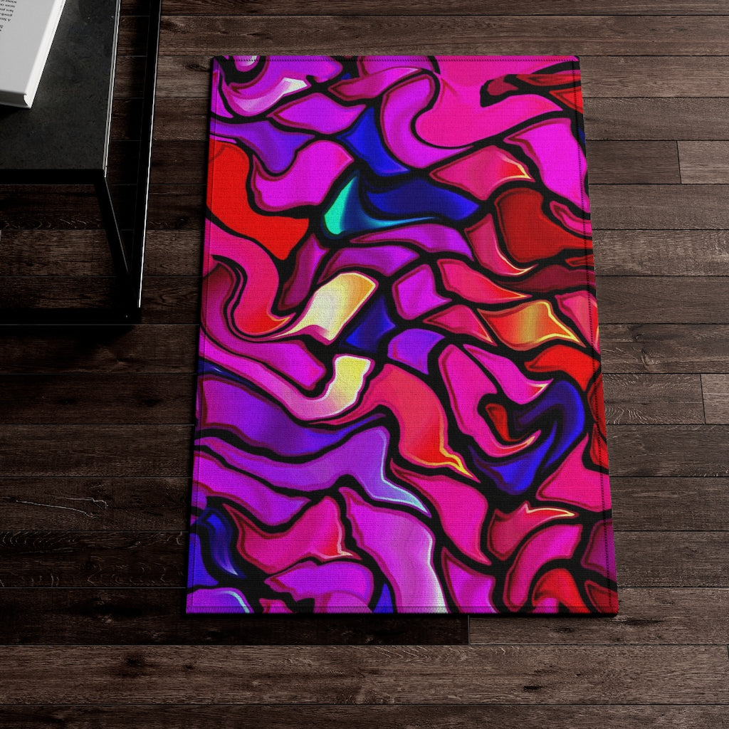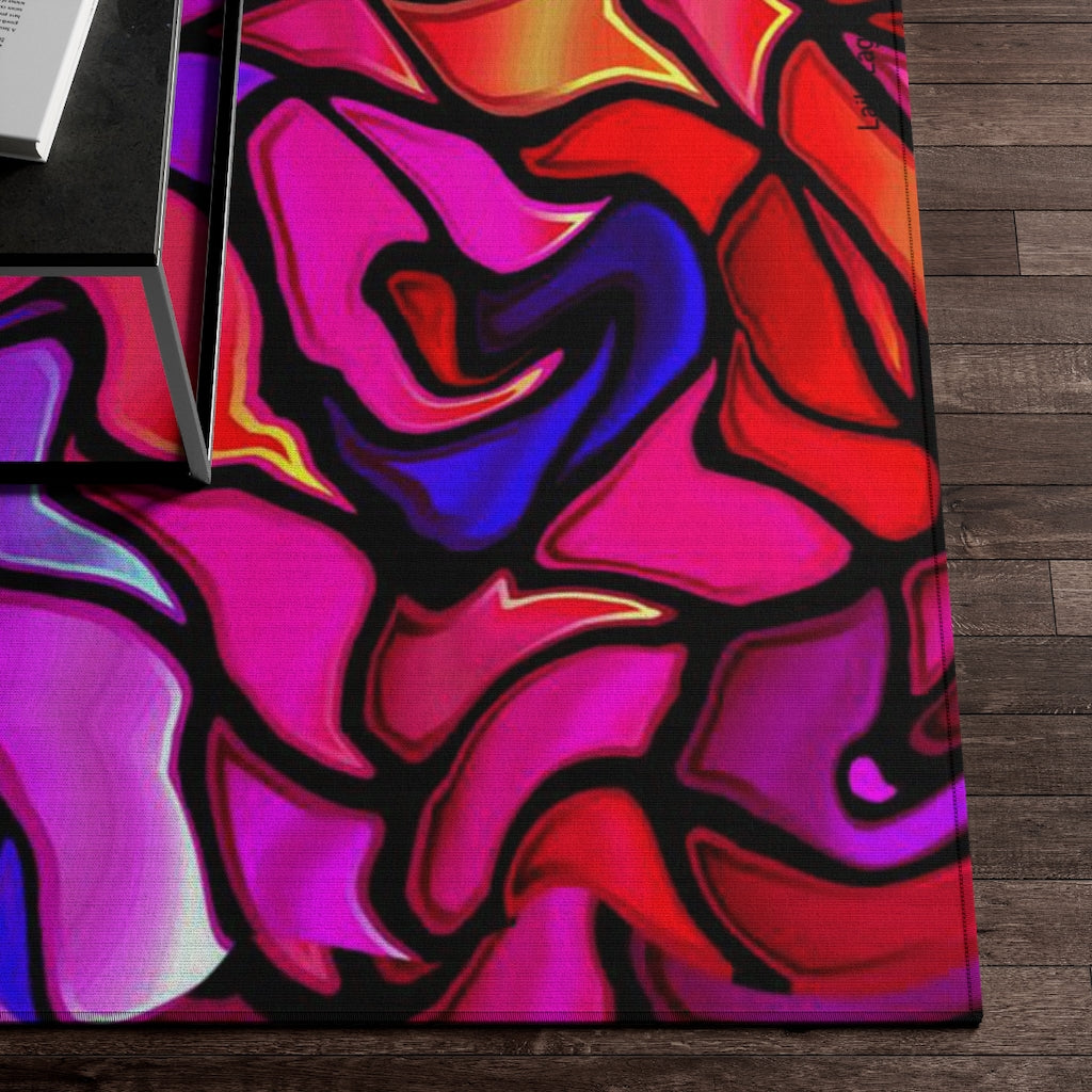 Disegni dell'artista Laila Lago & C. di I.A. ricoprono questo tappeto, frutto di sperimentazioni cromatiche per dare un tocco moderno e creativo agli spazi della casa, da abbinare agli altri accessori della collezione MODERNAMENTE Con una superficie morbida come la seta da calpestare e un fondo antiscivolo per una maggiore sicurezza,  Disponibile in diverse misure per qualsiasi tipo di camera.
