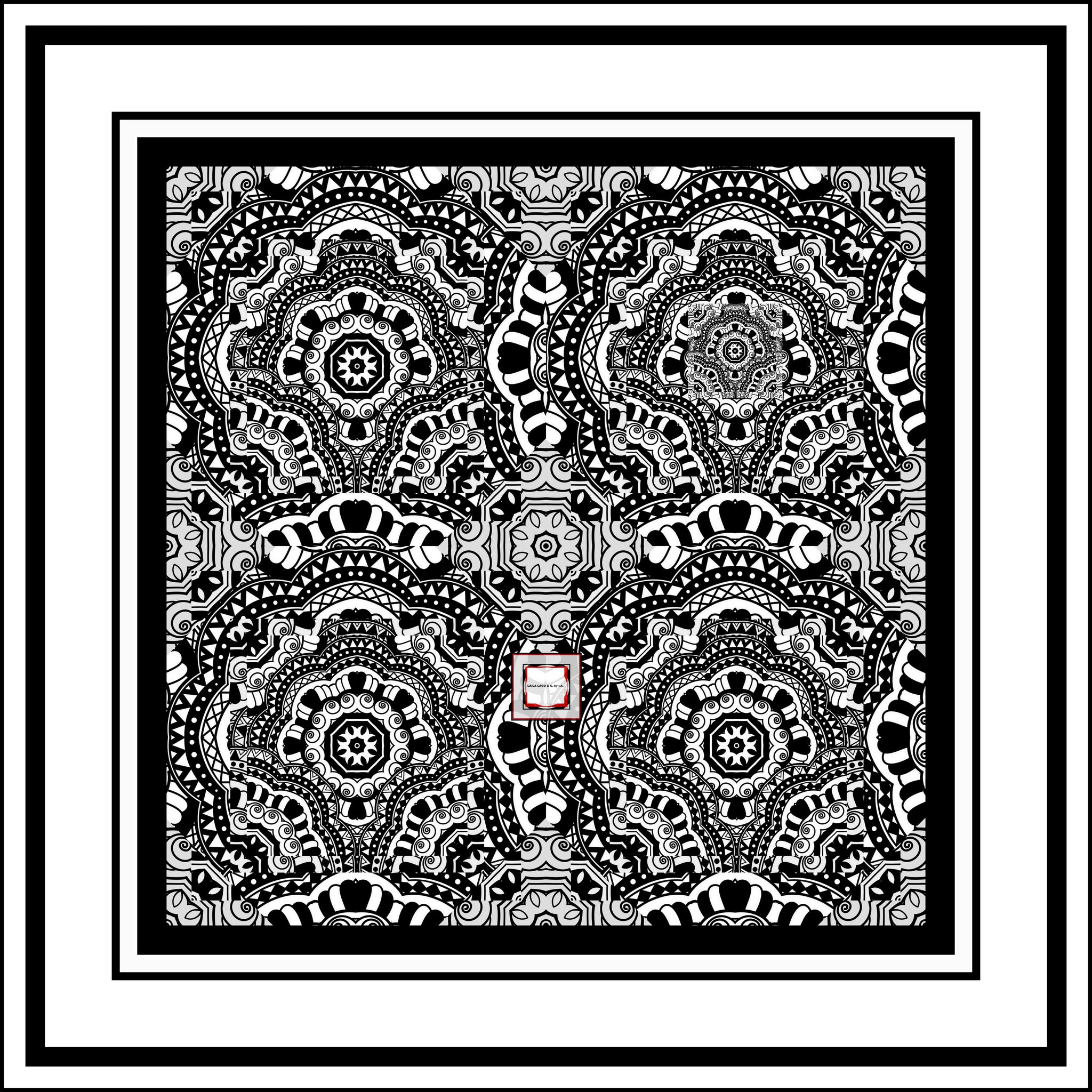 Collezione -MULTI GRAFICA - Laila Lago & C. By I.A. Per questa meravigliosa creazione dedicata a una donna creativa, che vive con arte e stile. I colori del nero si fondono in straordinari disegni grafici che trasformano ogni foulard in un'opera d'arte unica. Tessuto leggero e setoso • Stampa su un solo lato • Bordato da professionisti • Stampato con il mio disegno originale • Fatto a mano su ordinazione •  Doppio logo (davanti e dietro). Un accessorio versatile che esprime personalità e raffinatezza, perfetto per completare ogni look con un tocco di eleganza artistica."
