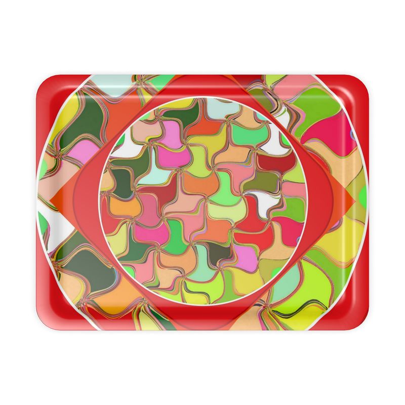 Elegante vassoio moderno con la stampa della collezione Mosaico, realizzato artigianalmente e la splendida stampa con cromatismi infiniti della collezione dedicata all' arte contemporanea Laila Lago e C. by I.A. con logo del marchio sul retro