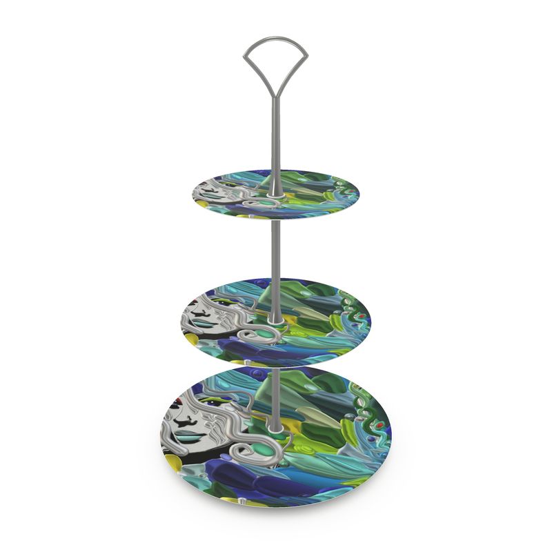 Alzatina per dolci personalizzata Linea "Il fiume di Galatea" - Laila Lago & C. by I.A.Una splendida stampa artistica ricopre l'alzatina regalando un elegante tocco artistico, versatile e creativa ravviva lo spazio casa con il logo del marchio stampato. Realizzata a mano su ordinazione, questa alzatina per dolci a 3 piani è perfetta per presentare torte, pasticcini e dolcetti con stile.Con un'altezza di circa 35 cm, questa alzatina combina funzionalità ed estetica: facile da montare e dotata di un pratico manico per il trasporto, è ideale sia per occasioni speciali che per l'uso quotidiano. Ogni pezzo è unico, creato artigianalmente su richiesta per portare l'arte della collezione "Il fiume di Galatea" nella tua casa.