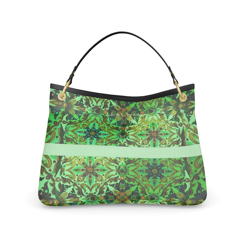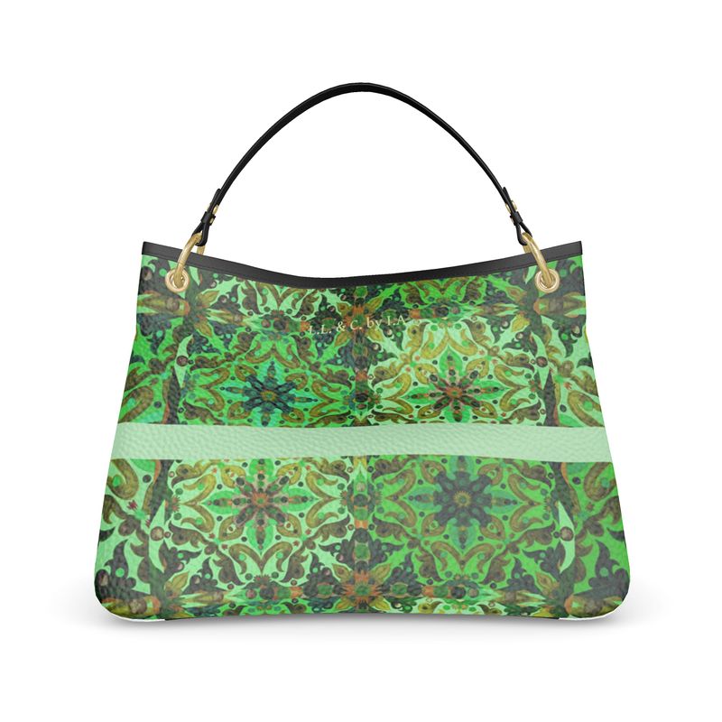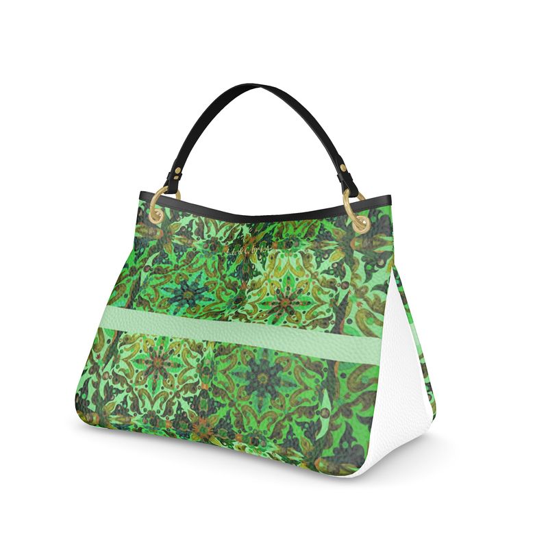 Elegante borsa capiente in pelle testurizzata, realizzata artigianalmente con logo stampato della casa, all' esterno e all' interno, stampa artistica floreale con splendidi colori che rendono questa borsa un accessorio prezioso dettagli dorati