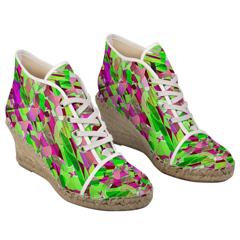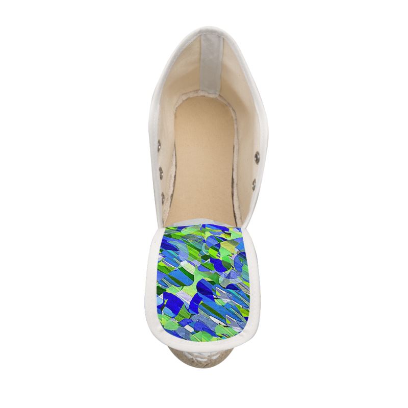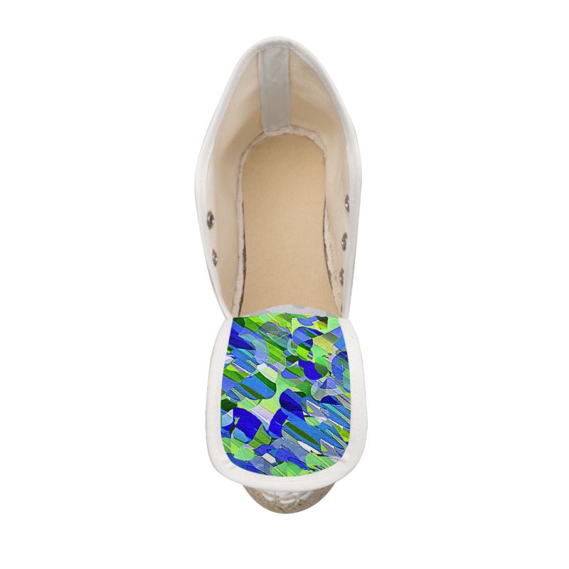 Espadrilles, con tacco e pratici lacci, eleganti e raffinate con stampa sui toni del verde e dell' azzurro.Dalla collezione-GIOIA-Laila Lago & C. by I.A. la meravigliosa stampa brillante ricopre le espadrillas donando un tocco di stile e arte.