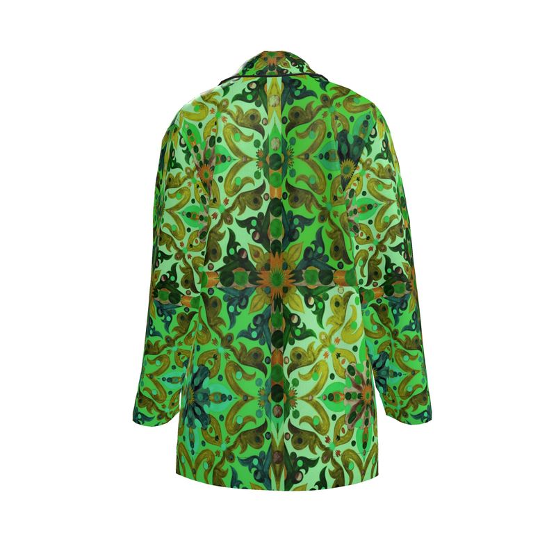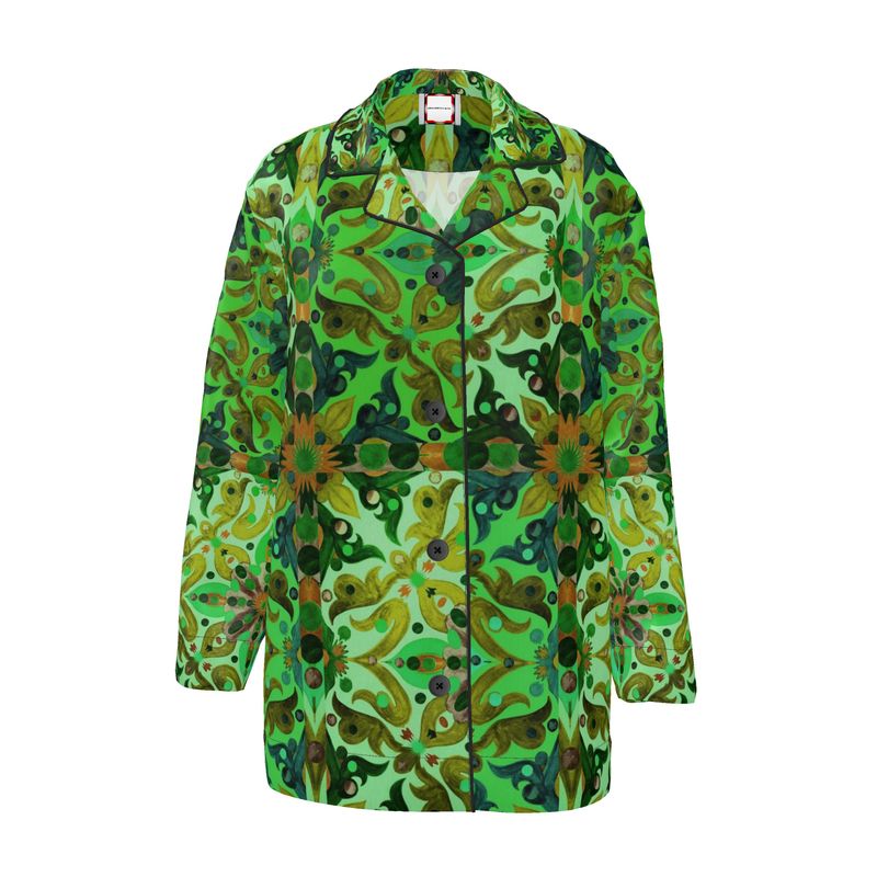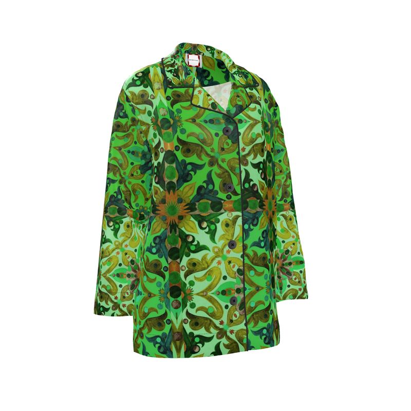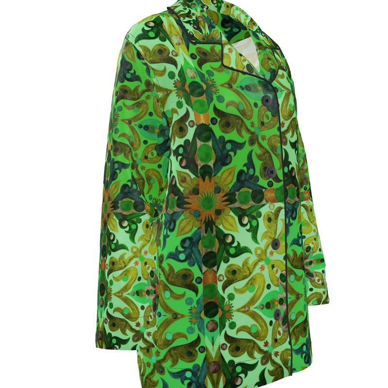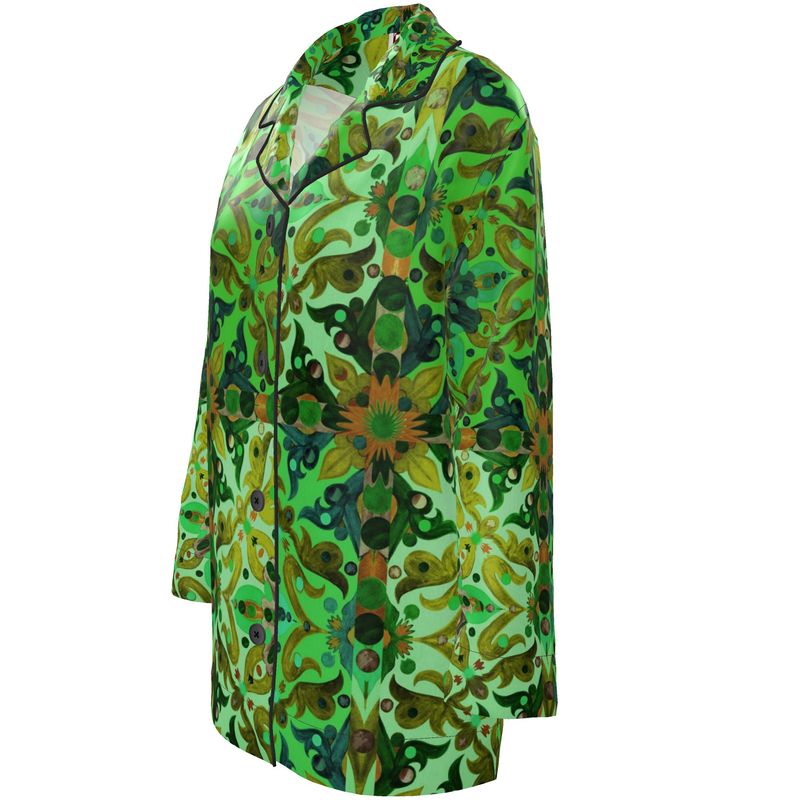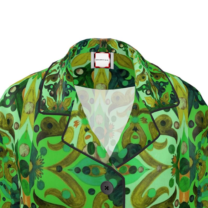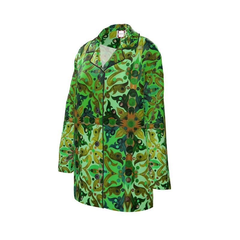 Giacca del pigiama in seta linea Acquarelli verdi in raso di vera seta, un capo raffinato di rara eleganza da abbinare ai pantaloni del pigiama della stessa linea.Disegni e stampa acquarellata una speciale stampa frutto di sperimentazioni cromatiche artistiche per questa magnifica collezione