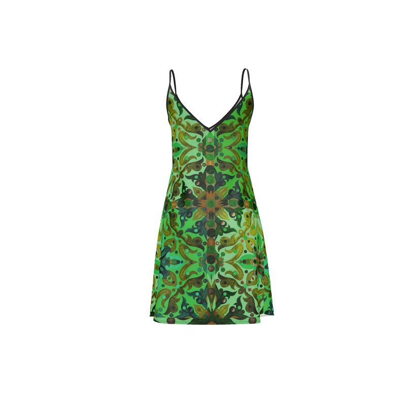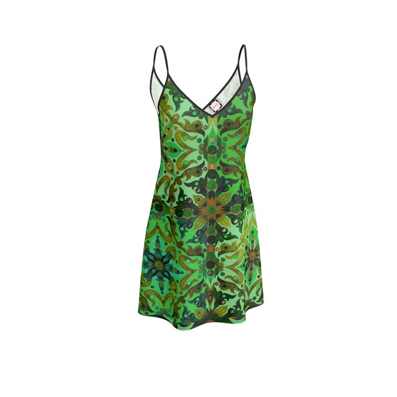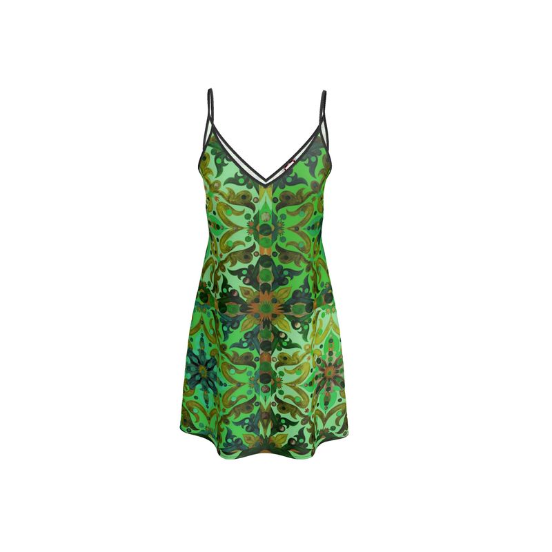 Elegante abito con spalline a contrasto linea Acquarelli verdi. Scivola morbidamente regalando un senso di relax ed eleganza morbida e raffinata realizzato artigianalmente