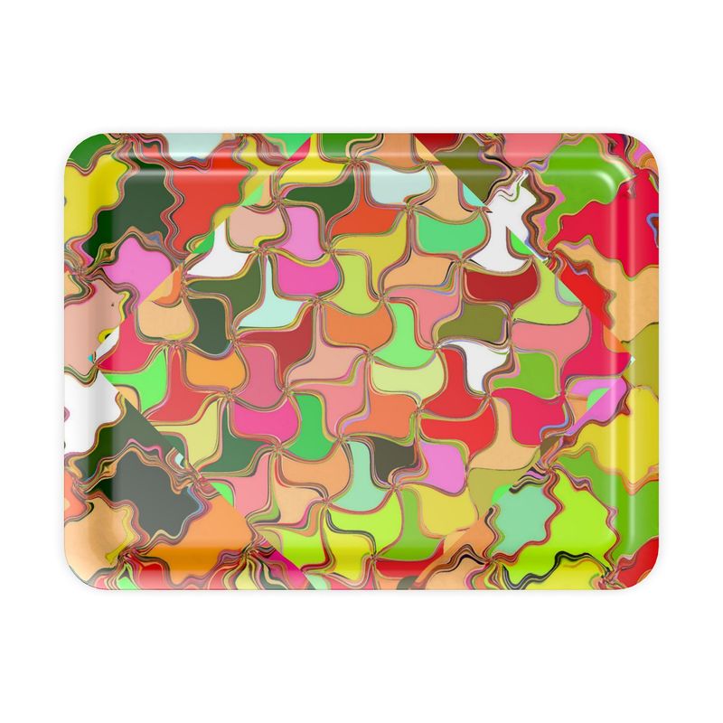 Elegante vassoio moderno con la stampa della collezione Mosaico, realizzato artigianalmente e la splendida stampa con cromatismi infiniti della collezione dedicata all' arte contemporanea Laila Lago e C. by I.A. con logo del marchio sul retro
